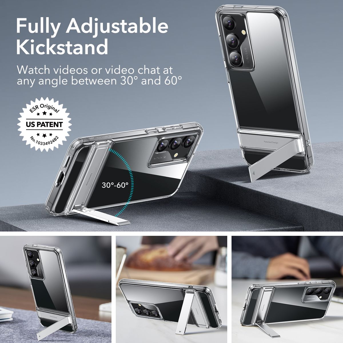 Fully Adjustable Kickstand: Transform your device into a personal entertainment hub with our fully adjustable kickstand. Watch videos or video chat effortlessly at any angle between 30 and 60 for the perfect viewing experience.