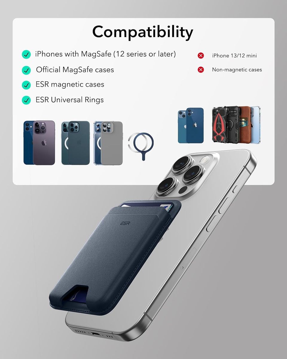 MagSafe Compatibility: The ESR Boost Wallet is fully compatible with iPhone 16 /15 /14 /13 /12 series and all MagSafe cases excluding iPhone 12 Mini / 13 Mini. Whether you’re using it with a MagSafe case or directly with your iPhone, the magnets align perfectly for a snug fit and reliable attachment.